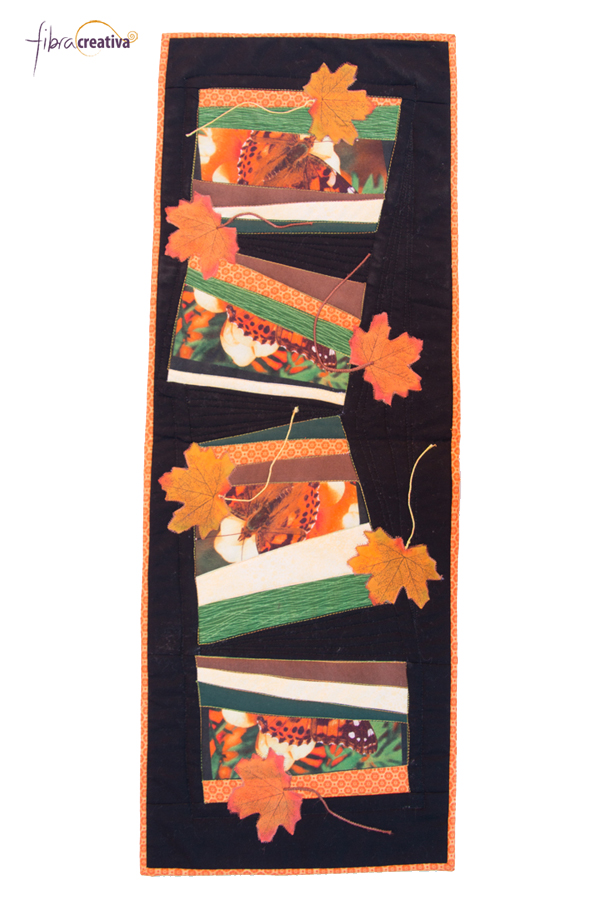 camino de mesa de patchwork-con mariposas y hojas de otoño fondo negro