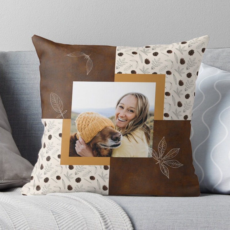Fall patchwork pillow with custom printed picture of woman and her dog