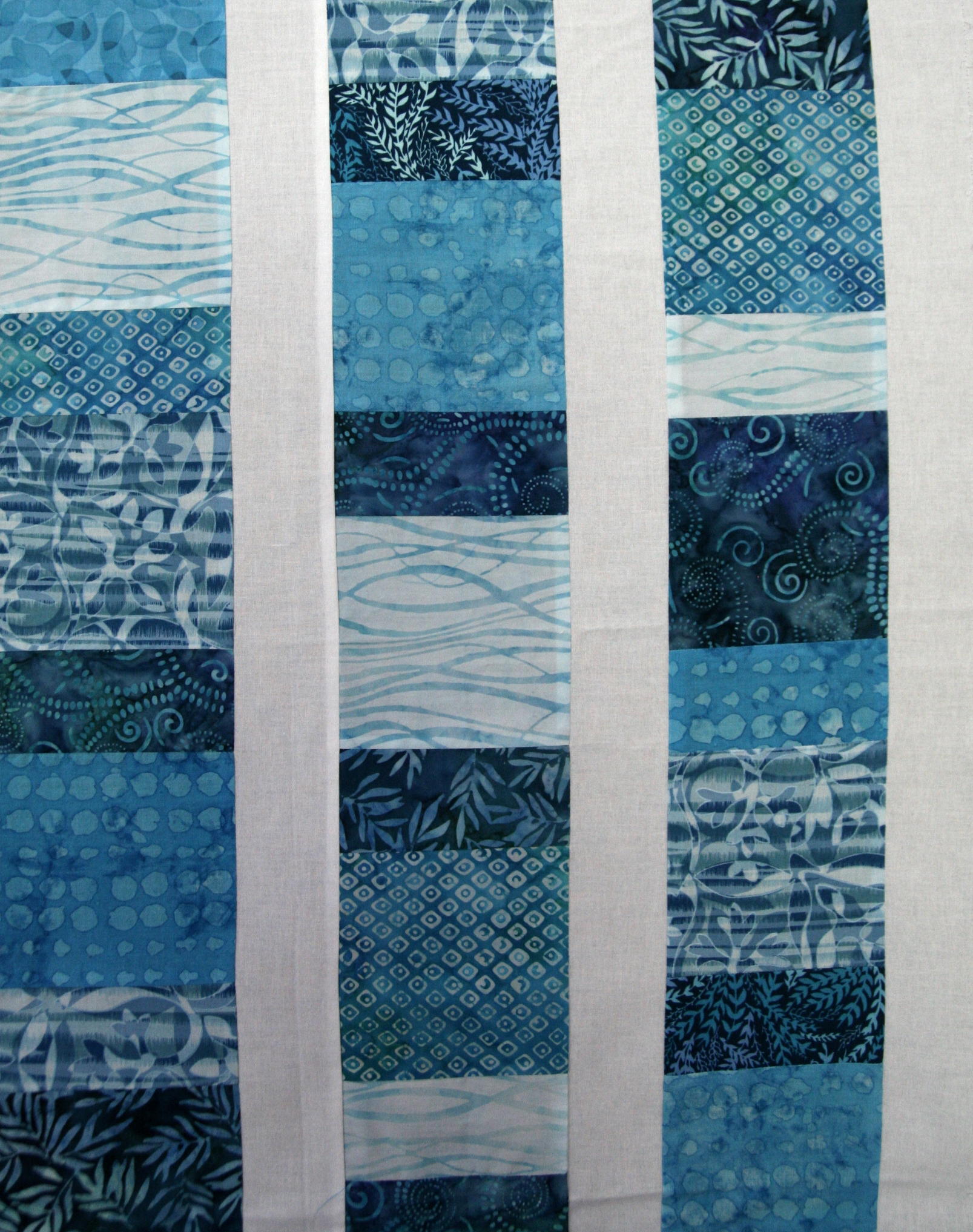 Quiltde patchwork actual, de batiks y estampados color azul turquesa, y blanco, inacabado.