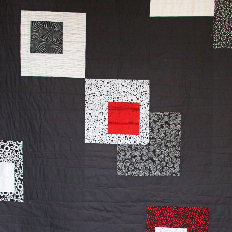 Detalle de quilt de patchwork moderno cuadrados imbricados negro blanco rojo
