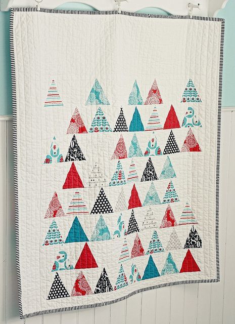 quilt de patchwork triangles sapins de noel rouge bleu glacier fond blanc
